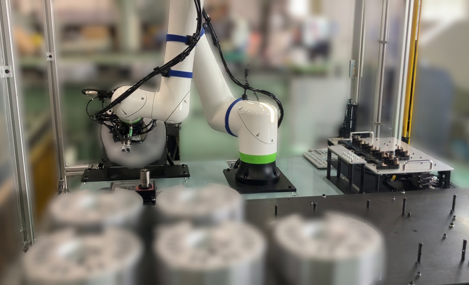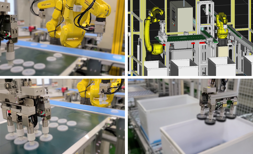 ②取出し位置に到達した製品は別のロボットによって自動箱詰め