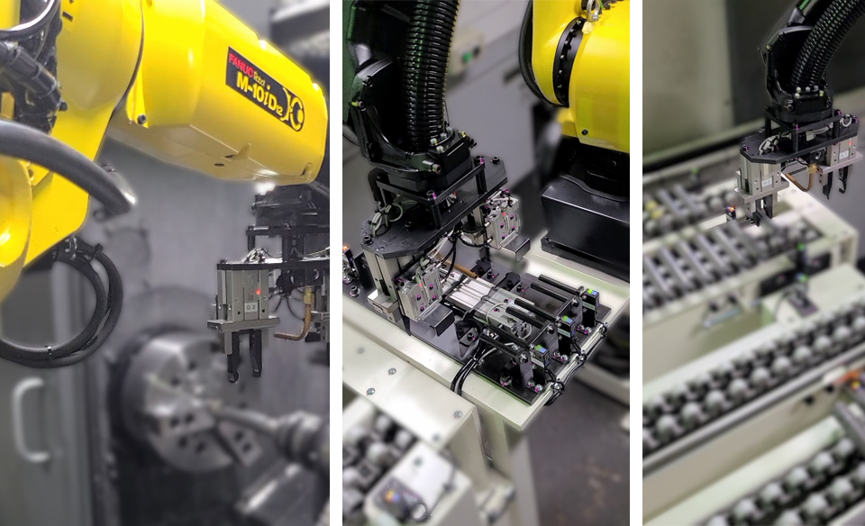 ①ストッカの素材レーンから円筒ワークを取り出し、2台の旋盤へ取付け
